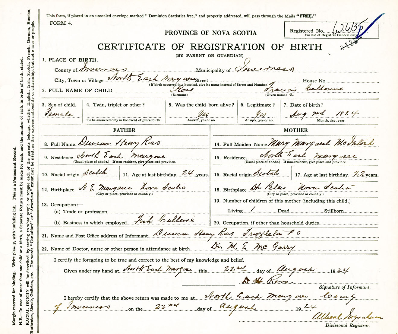 Female Birth Registration: Year: 1924 number: 62600135