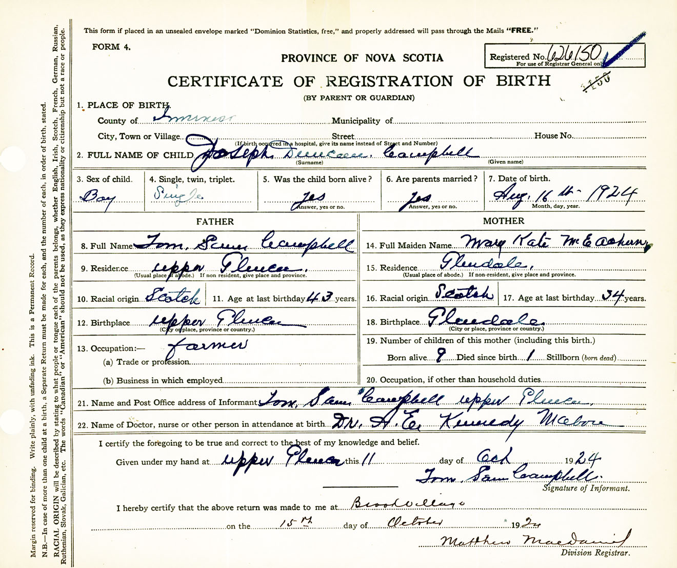 Male Birth Registration: Year: 1924 number: 62600150