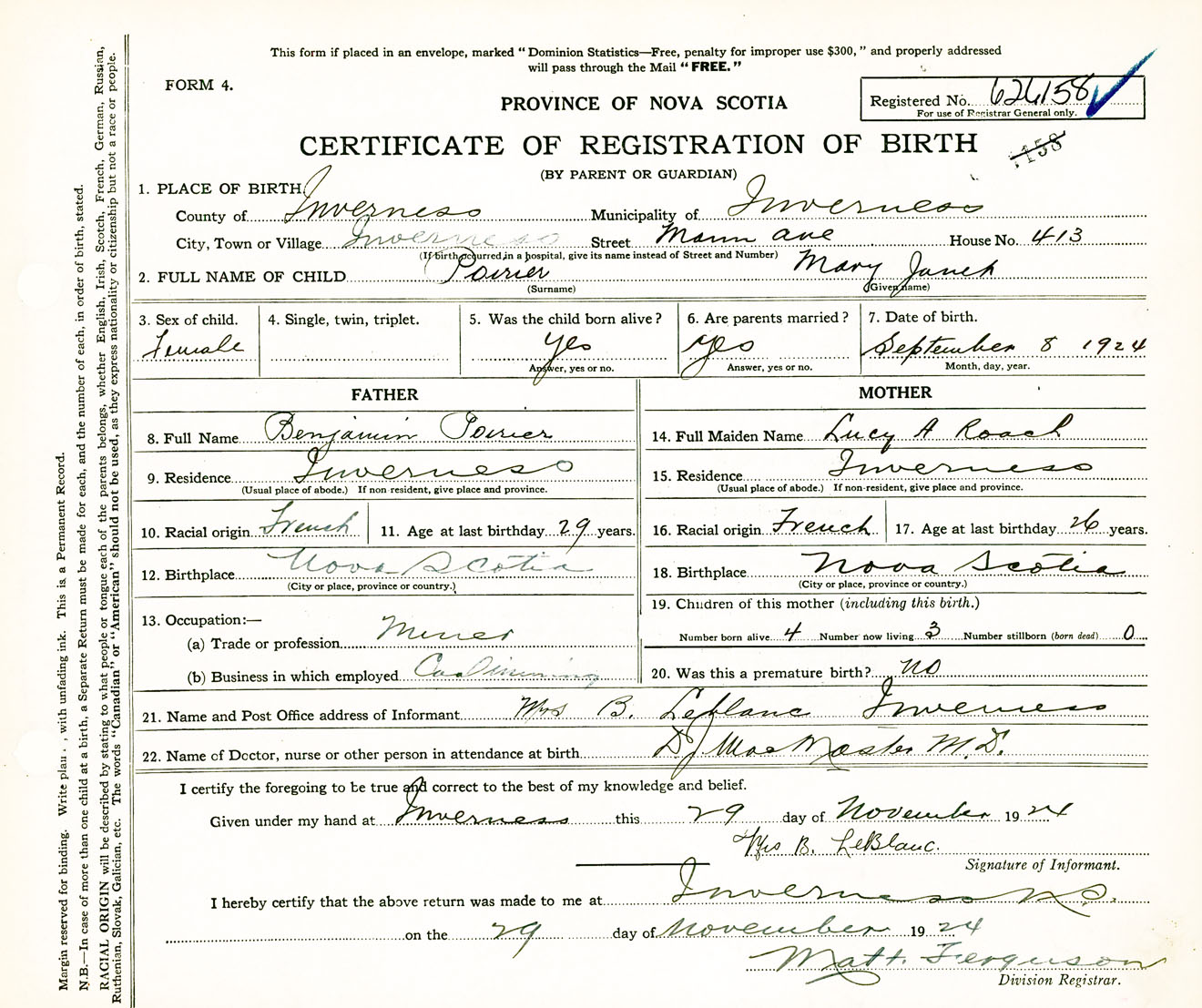 Female Birth Registration: Year: 1924 number: 62600158