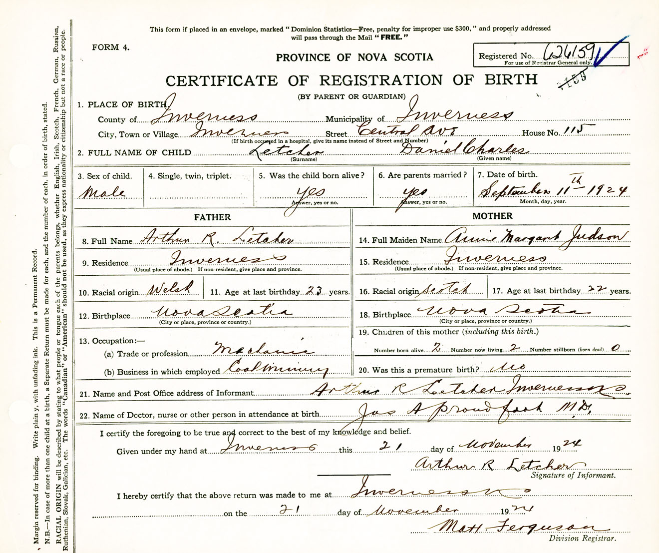 Male Birth Registration: Year: 1924 number: 62600159