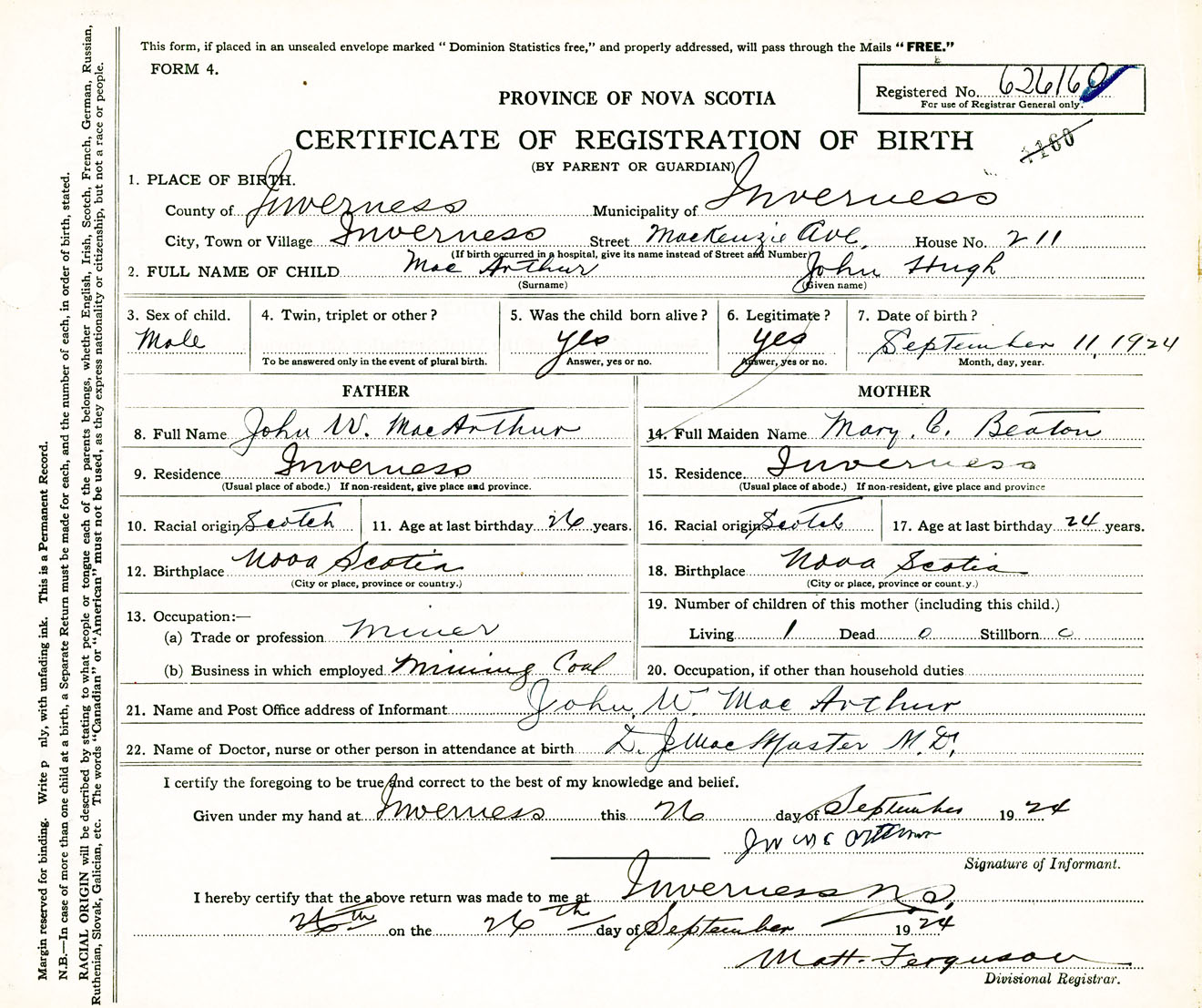 Male Birth Registration: Year: 1924 number: 62600160