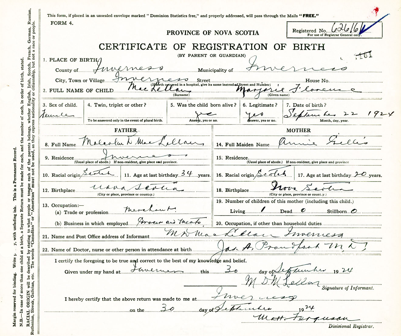 Female Birth Registration: Year: 1924 number: 62600161