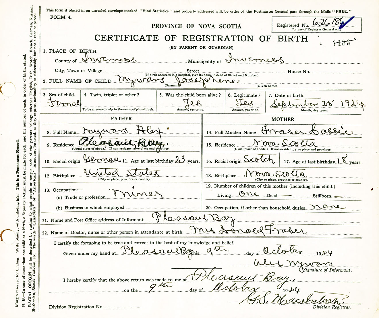 Female Birth Registration: Year: 1924 number: 62600186