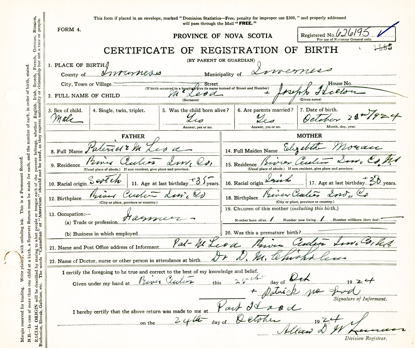 Male Birth Registration: Year: 1924 number: 62600195