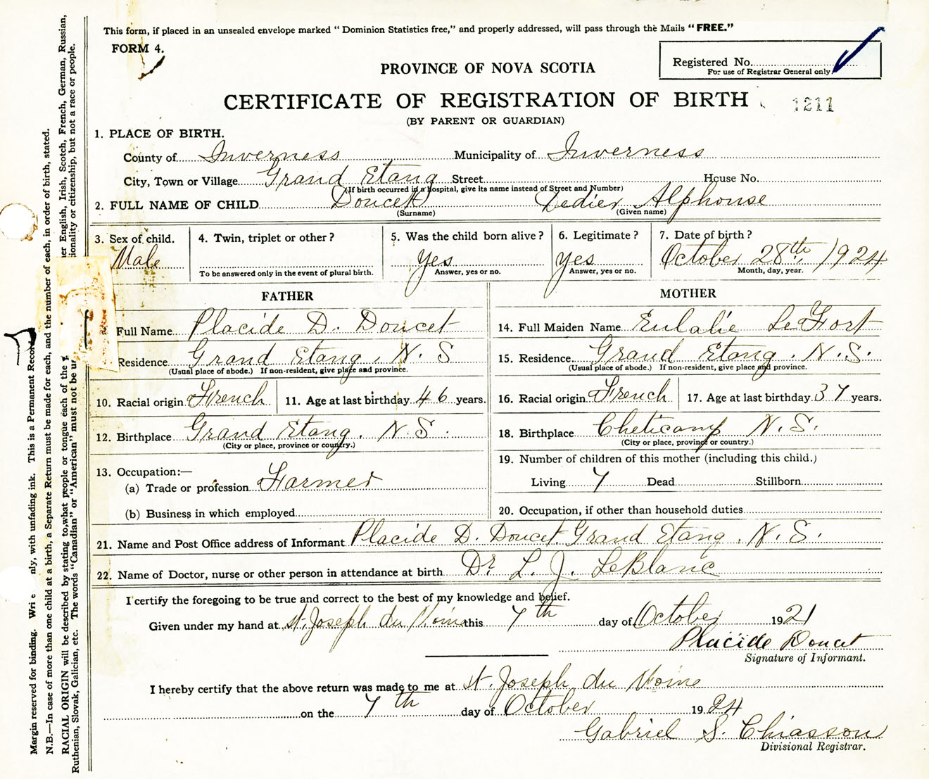 Male Birth Registration: Year: 1924 number: 62600211