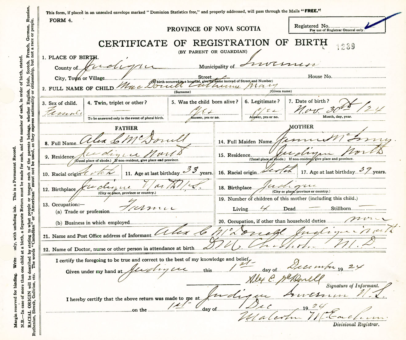 Female Birth Registration: Year: 1924 number: 62600239
