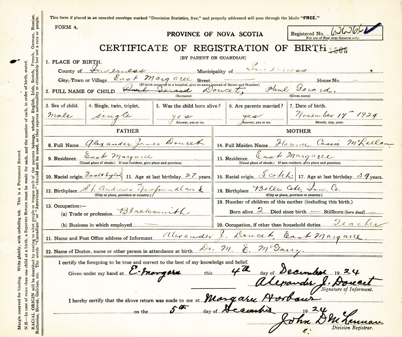 Male Birth Registration: Year: 1924 number: 62600266