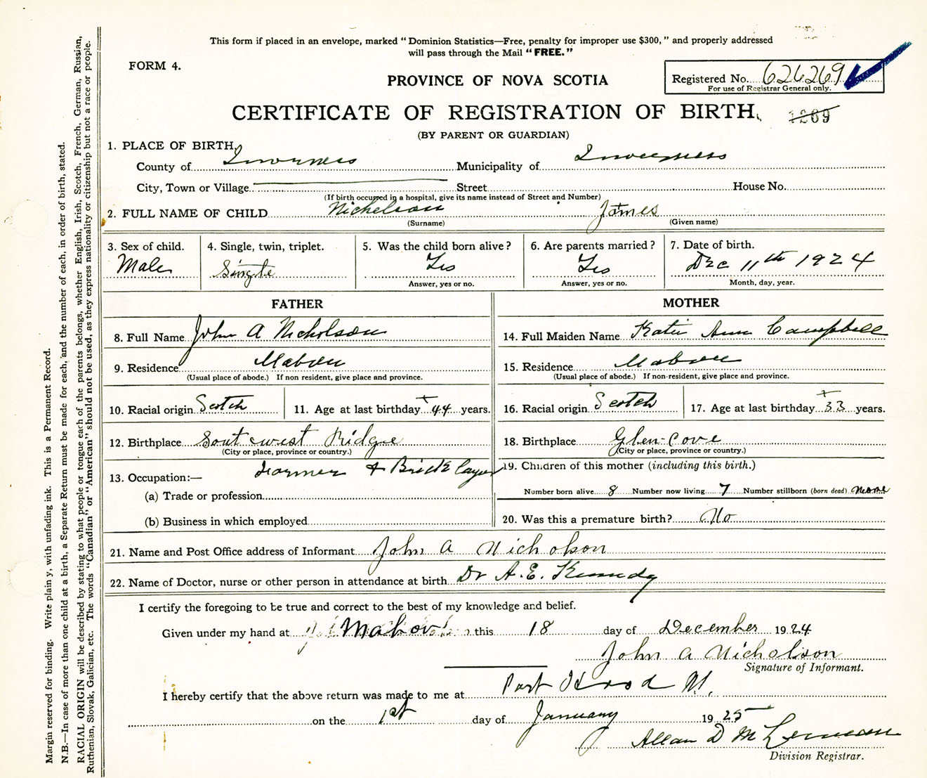 Male Birth Registration: Year: 1924 number: 62600269