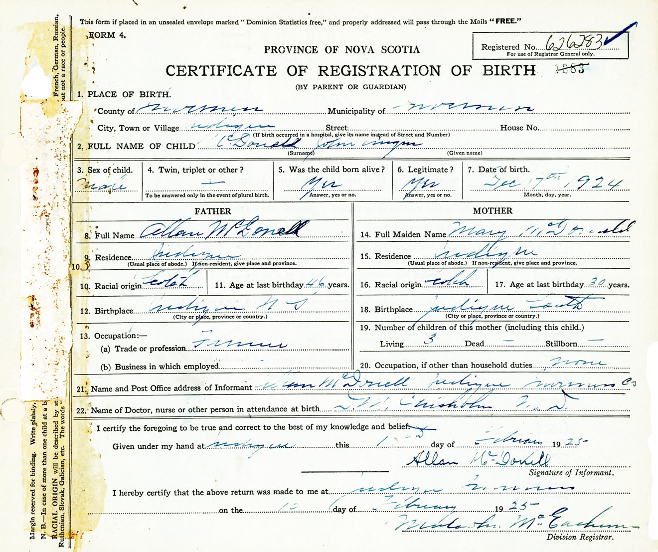 Male Birth Registration: Year: 1924 number: 62600283