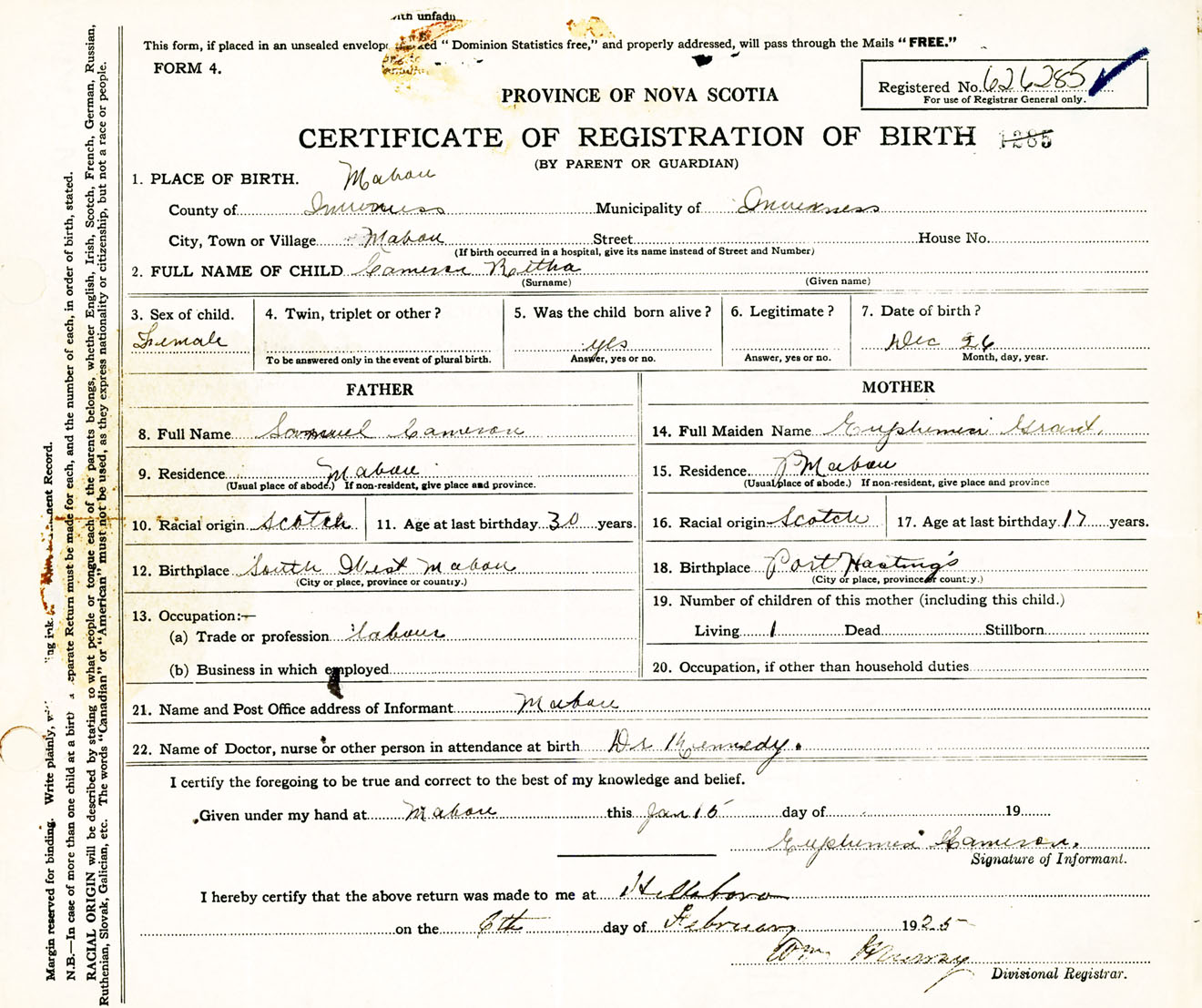 Female Birth Registration: Year: 1924 number: 62600285