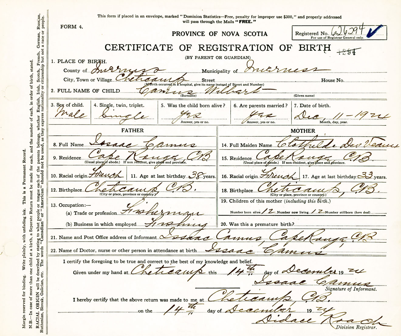 Male Birth Registration: Year: 1924 number: 62600294