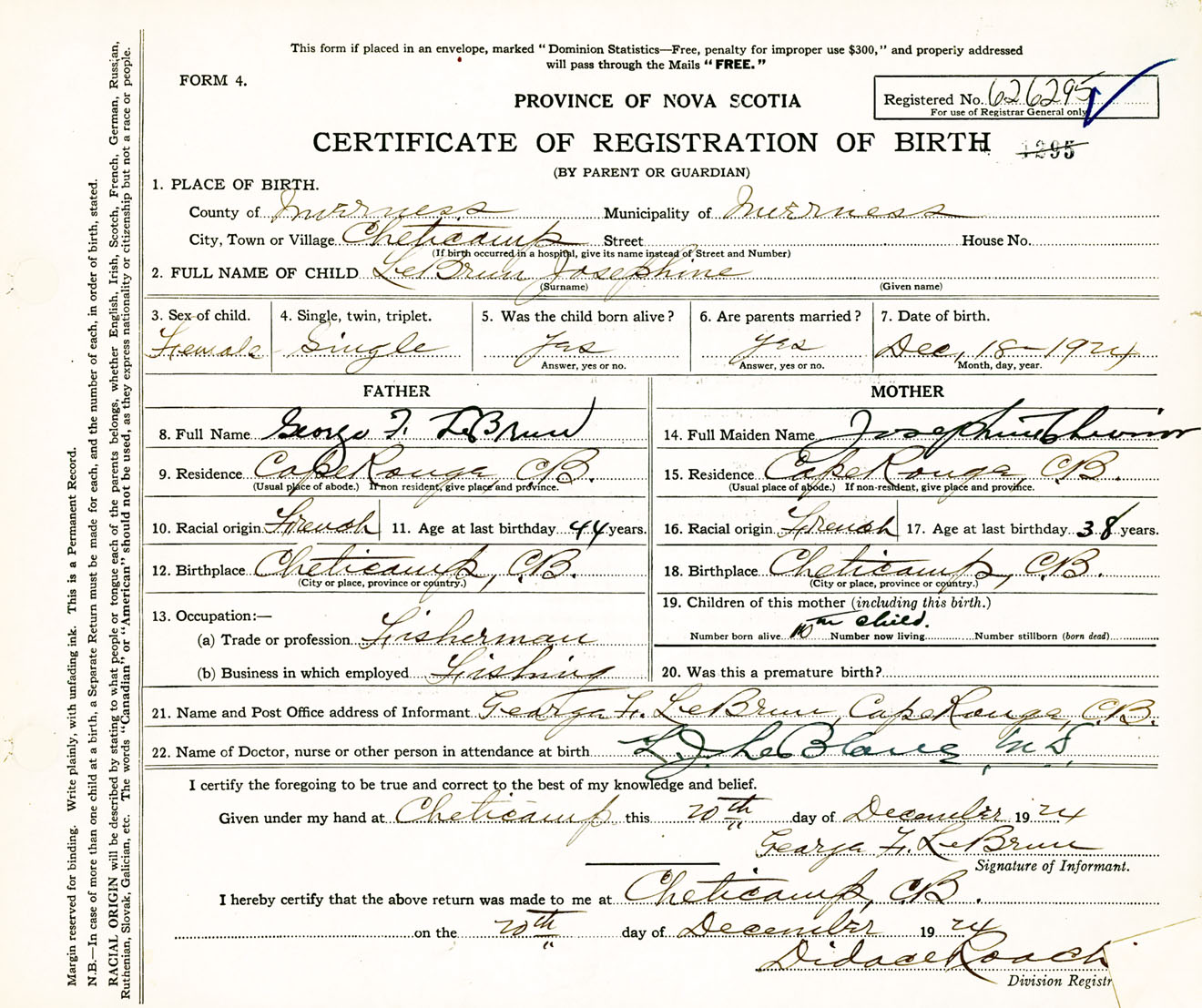 Female Birth Registration: Year: 1924 number: 62600295