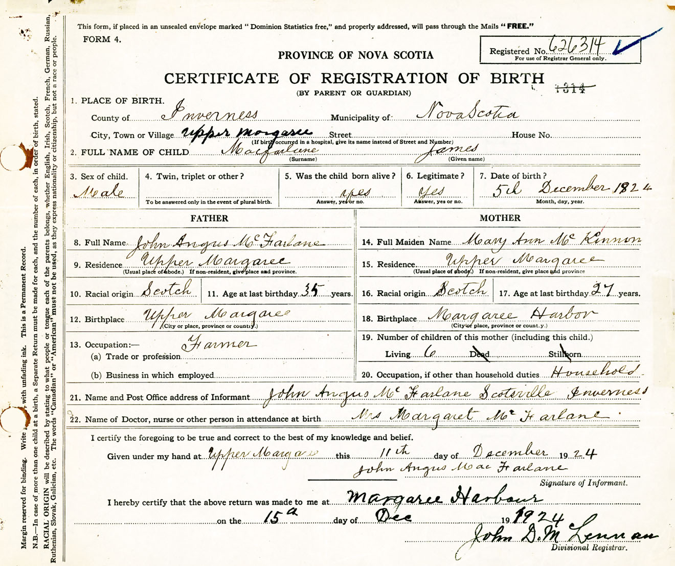 Male Birth Registration: Year: 1924 number: 62600314