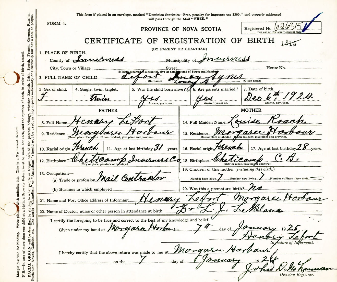 Female Birth Registration: Year: 1924 number: 62600315