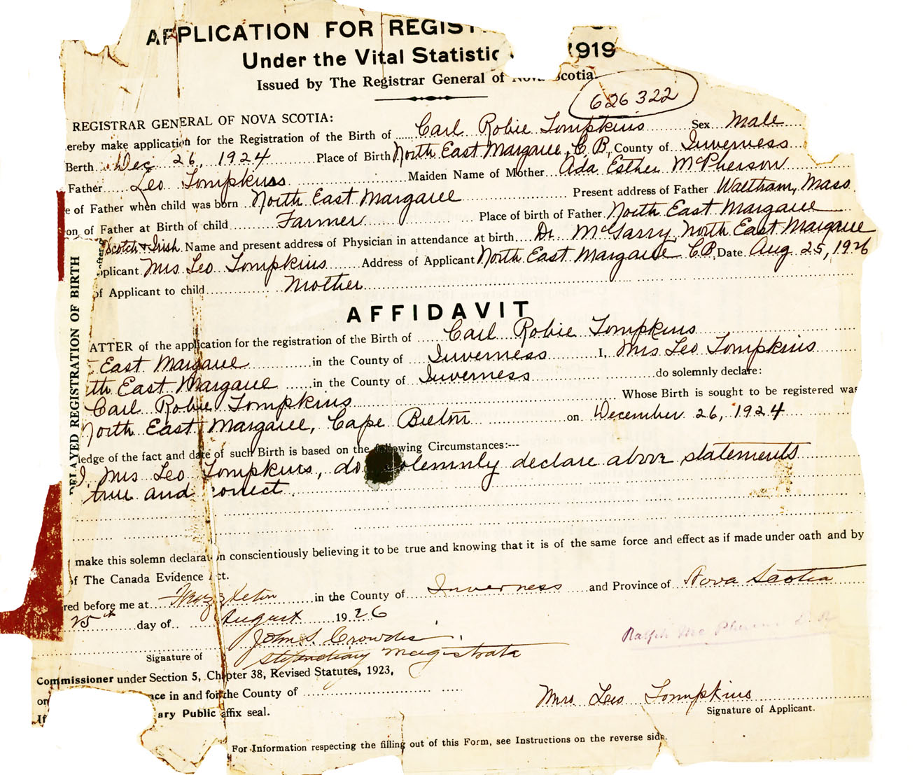 Signature of Applicant Mrs. Leo Tompkins Address of Applicant North East Margaree, Inverness Co., NS Date 25 August 1926