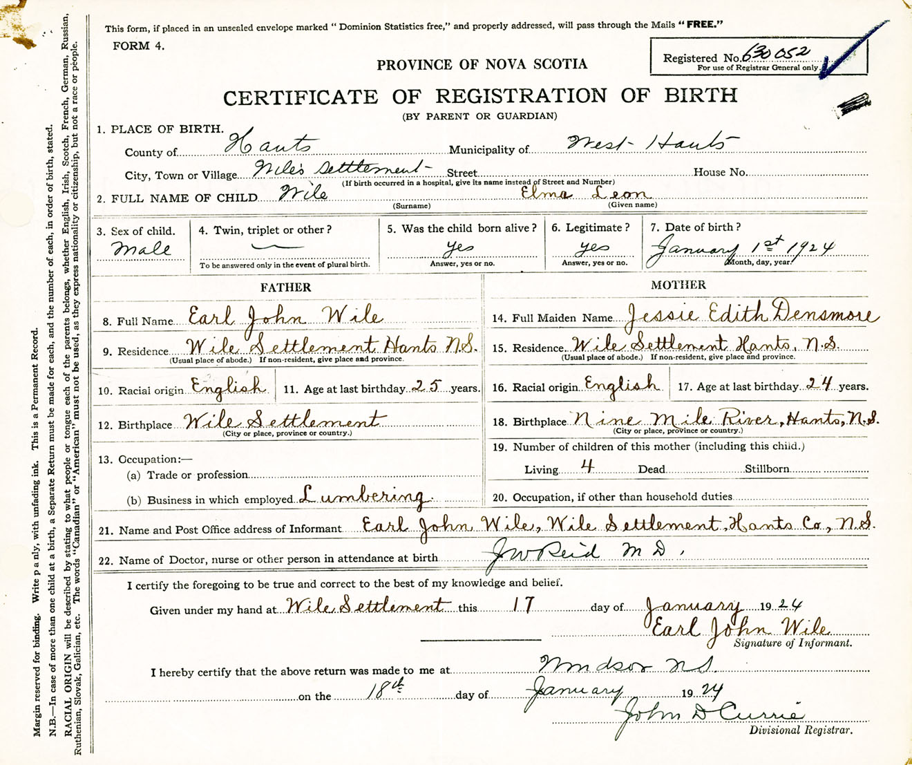 Male Birth Registration: Year: 1924 number: 63000052