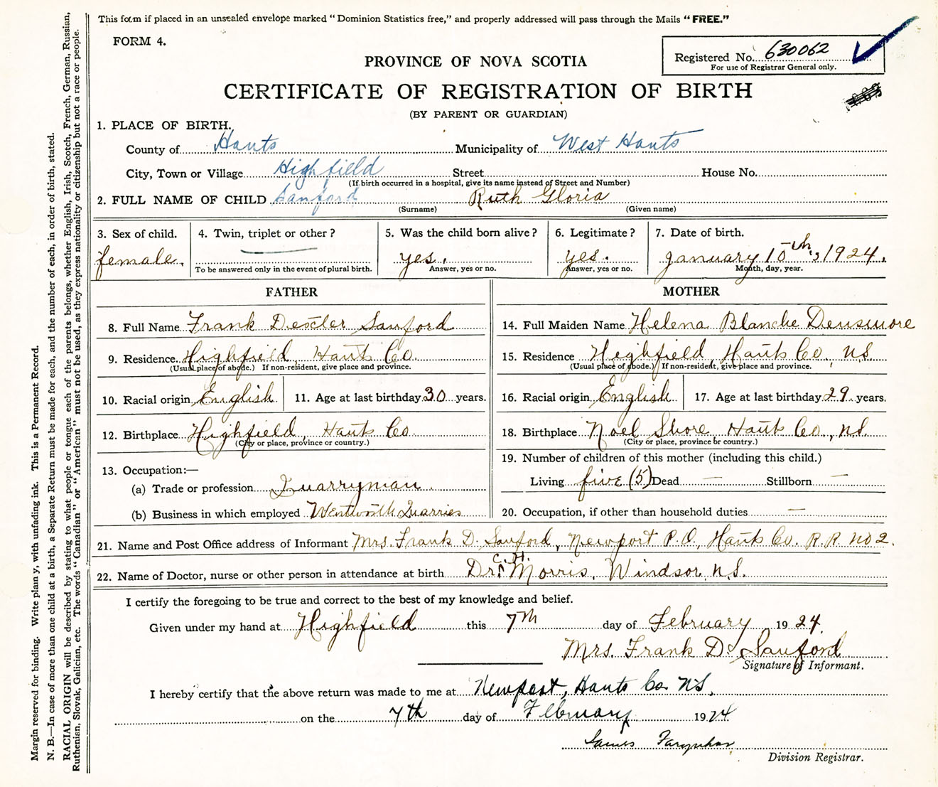 Female Birth Registration: Year: 1924 number: 63000062