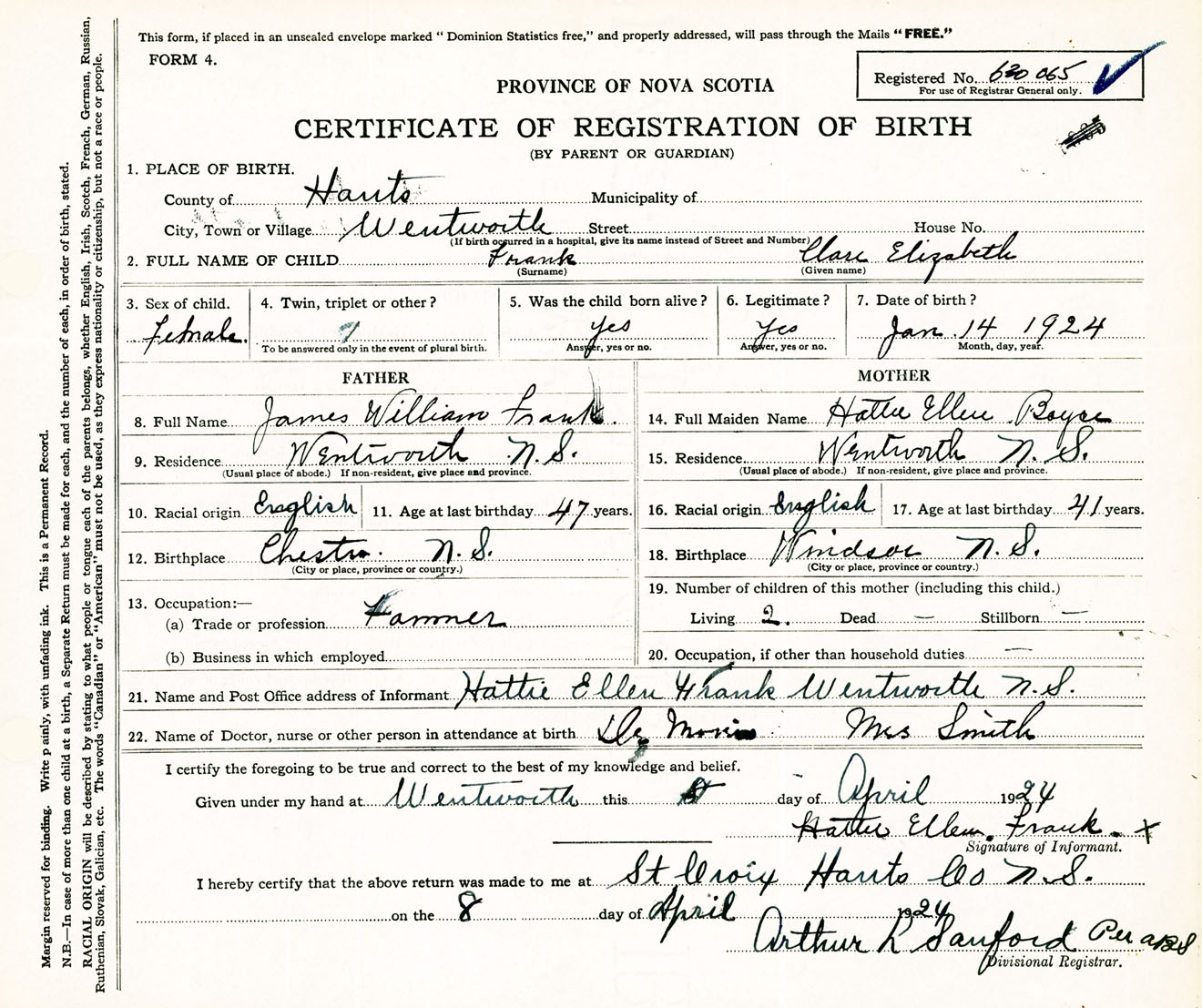 Female Birth Registration: Year: 1924 number: 63000065