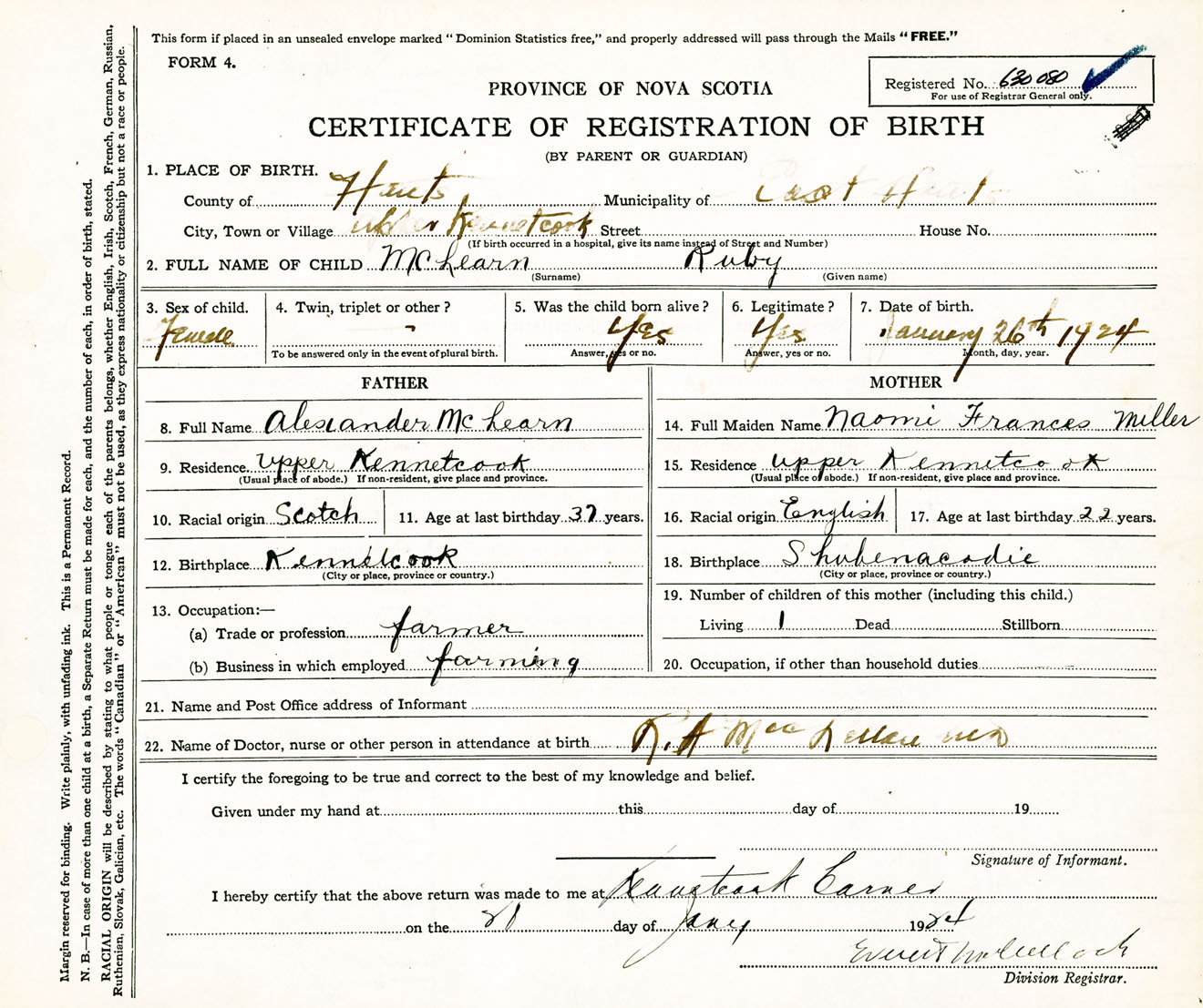 Female Birth Registration: Year: 1924 number: 63000080