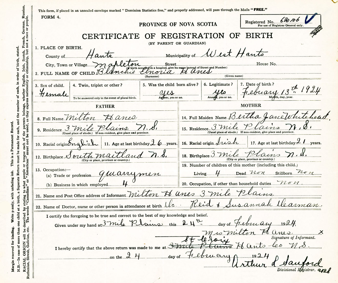Female Birth Registration: Year: 1924 number: 63000106