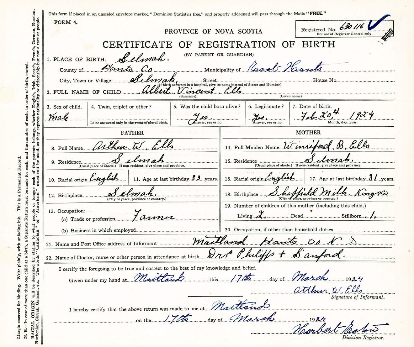 Male Birth Registration: Year: 1924 number: 63000116