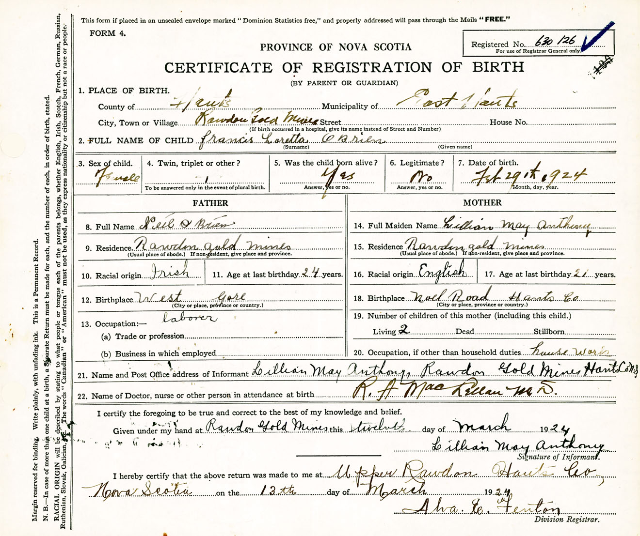 Female Birth Registration: Year: 1924 number: 63000126