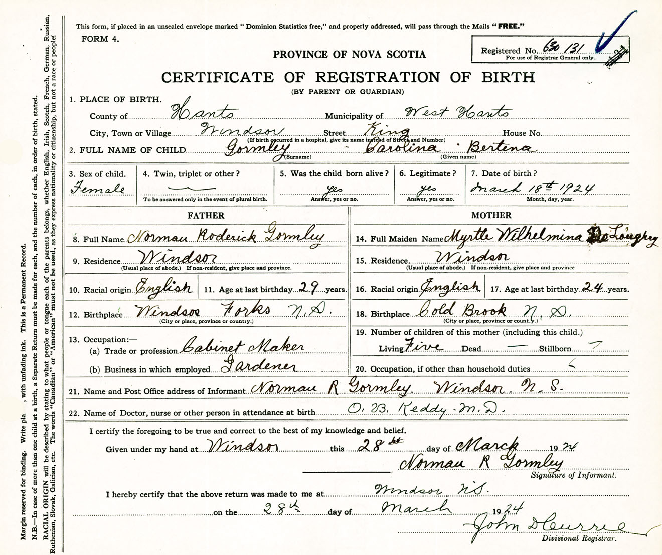 Female Birth Registration: Year: 1924 number: 63000131