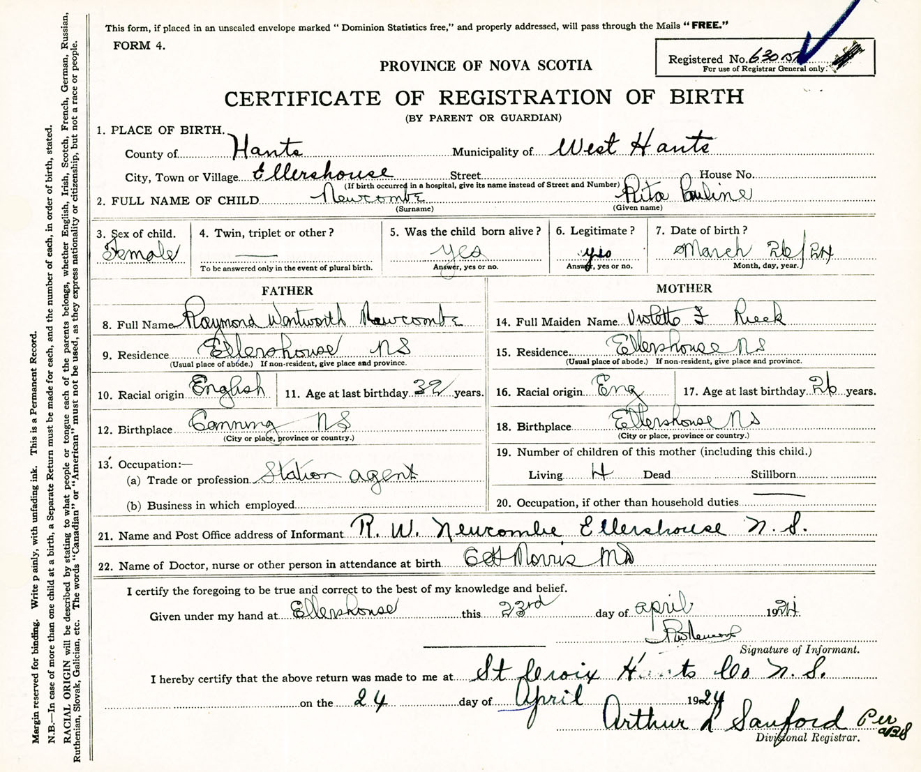 Female Birth Registration: Year: 1924 number: 63000151