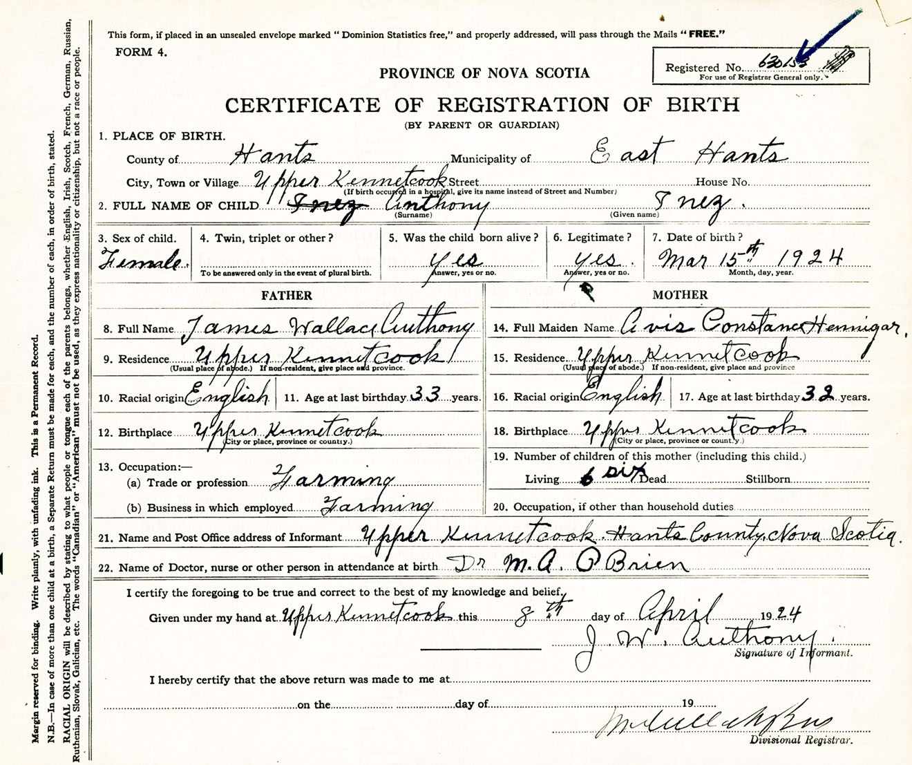 Female Birth Registration: Year: 1924 number: 63000153