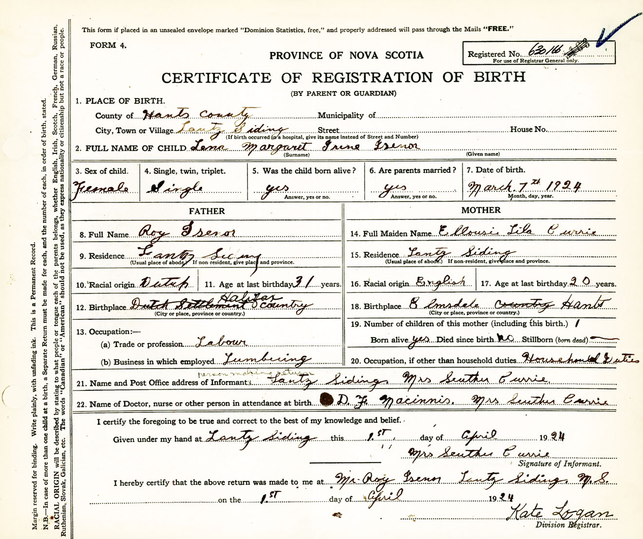 Female Birth Registration: Year: 1924 number: 63000166