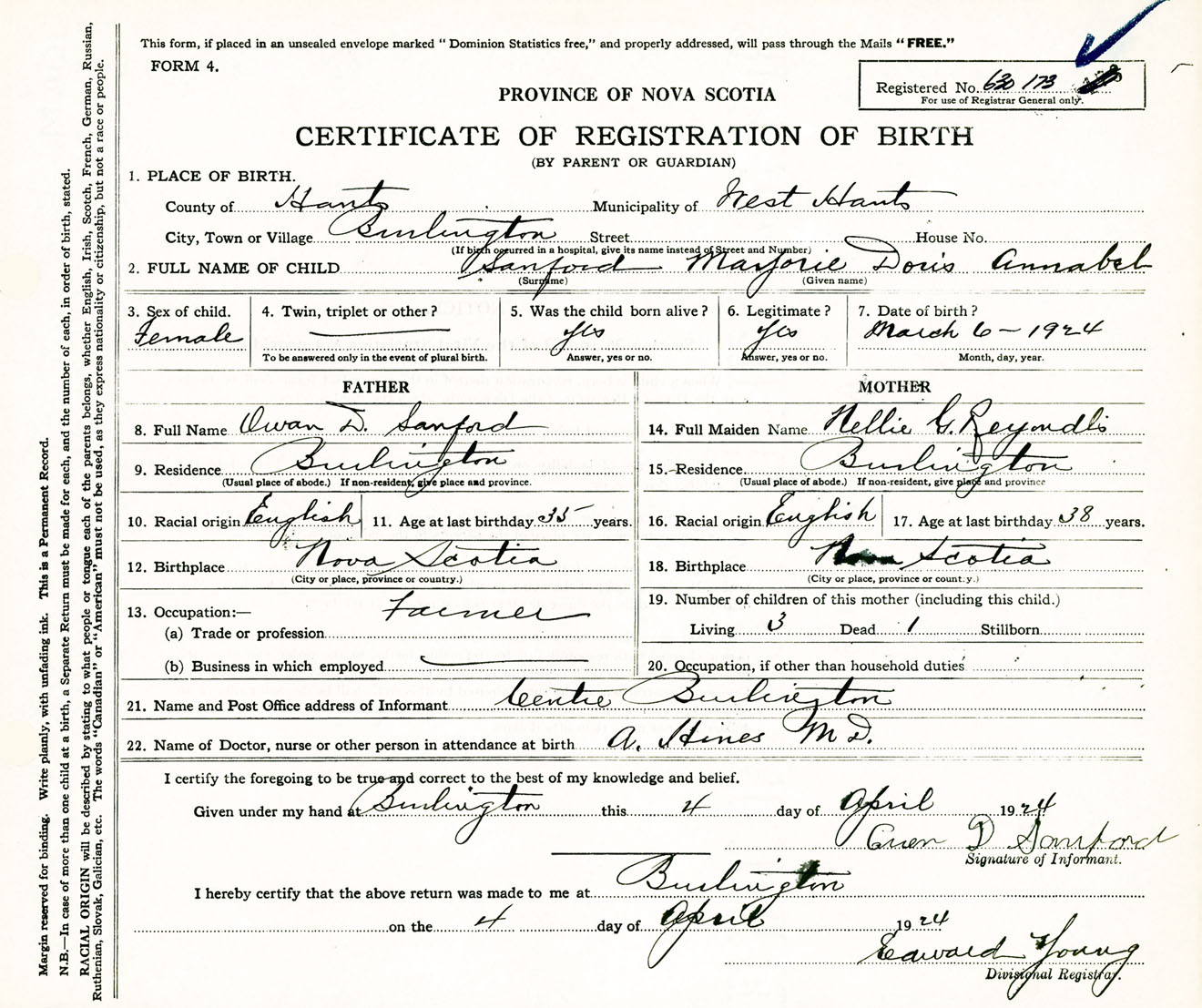 Female Birth Registration: Year: 1924 number: 63000173