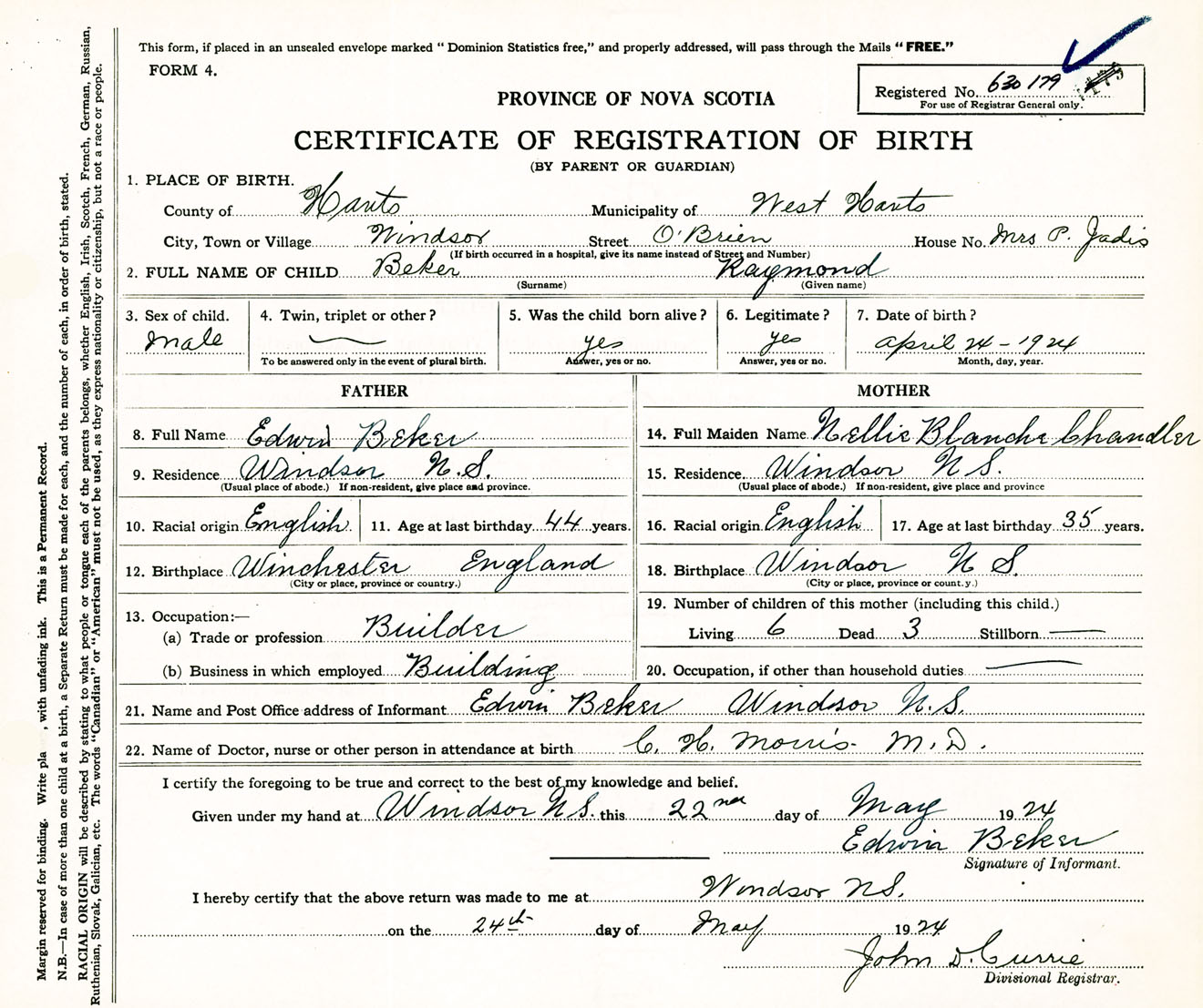 Male Birth Registration: Year: 1924 number: 63000179