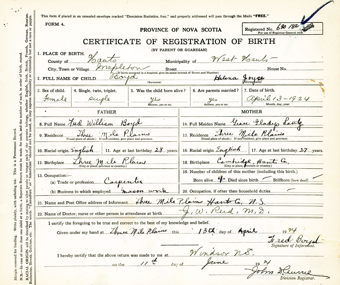 Female Birth Registration: Year: 1924 number: 63000182