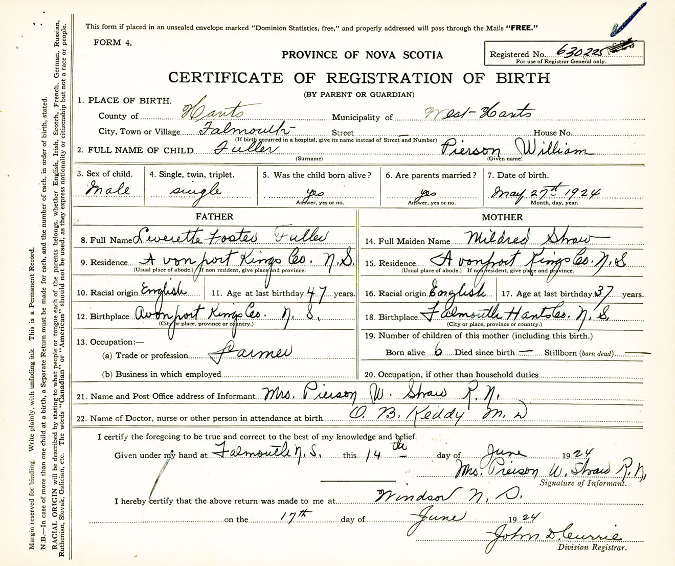 Male Birth Registration: Year: 1924 number: 63000225