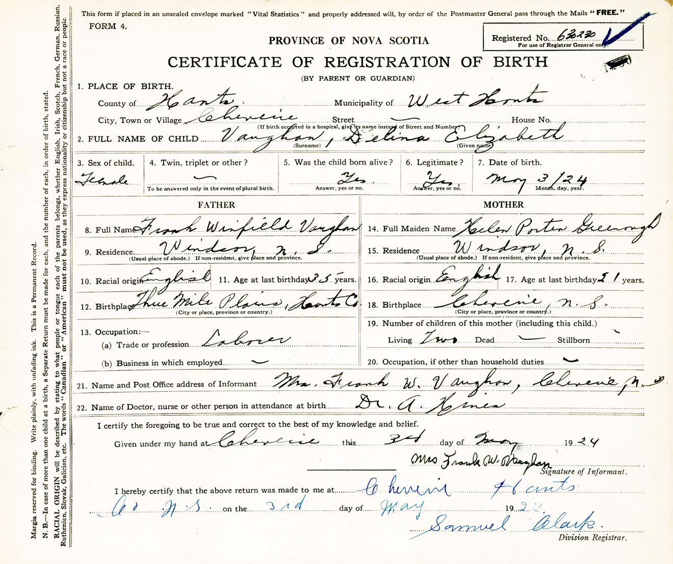 Female Birth Registration: Year: 1924 number: 63000230