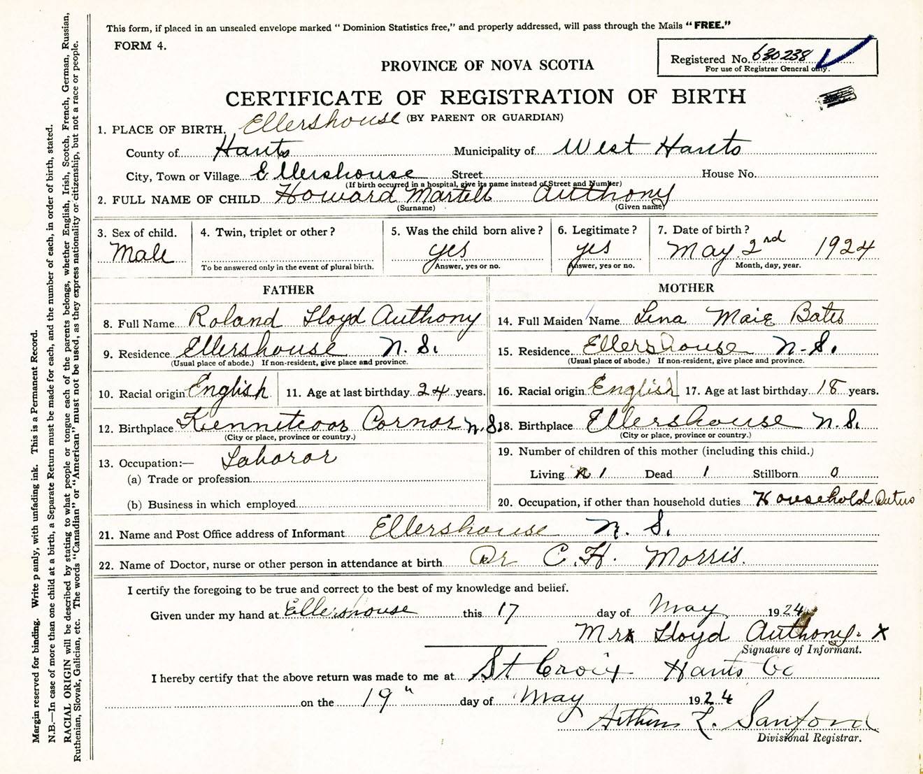 Male Birth Registration: Year: 1924 number: 63000238