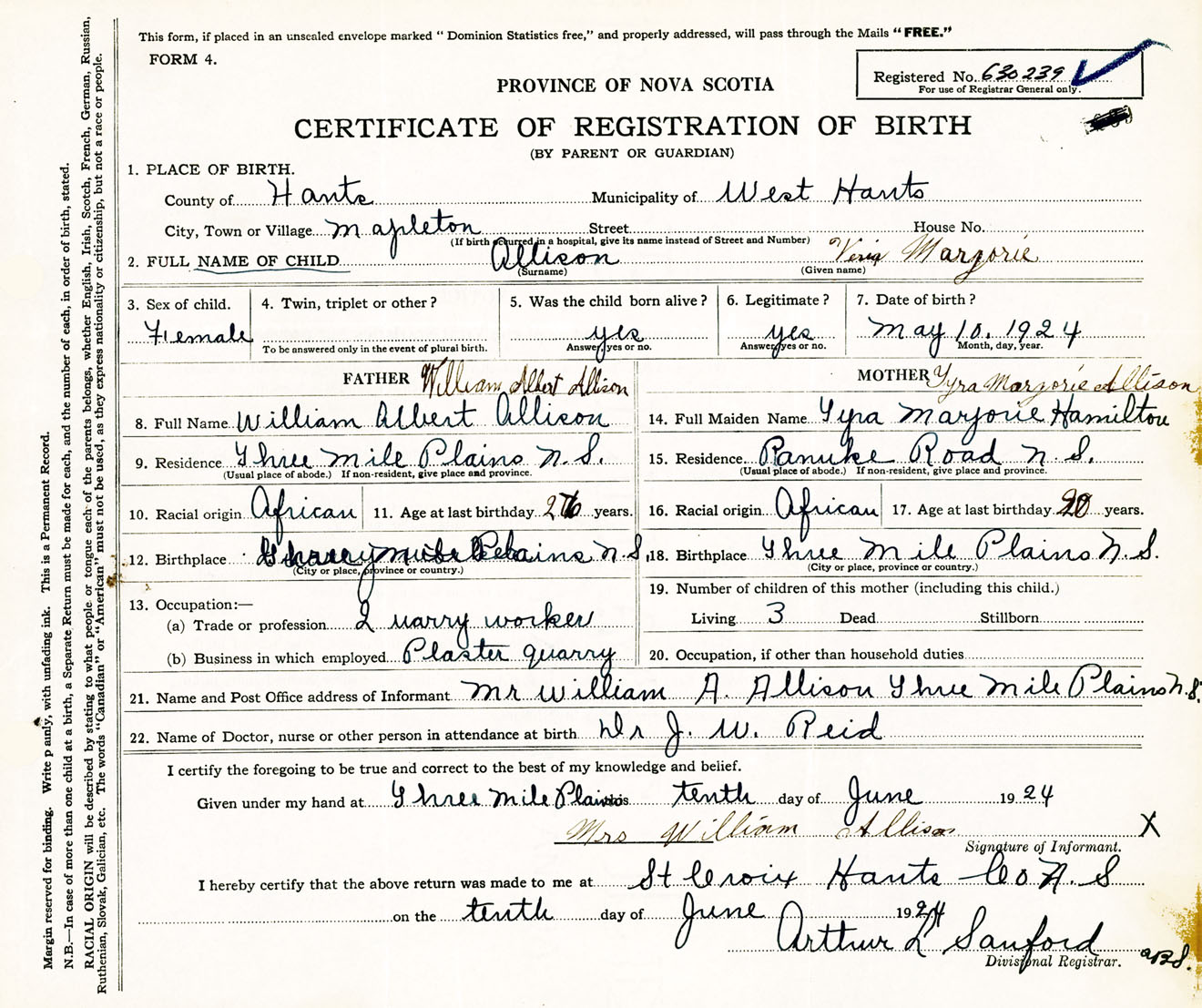 Female Birth Registration: Year: 1924 number: 63000239