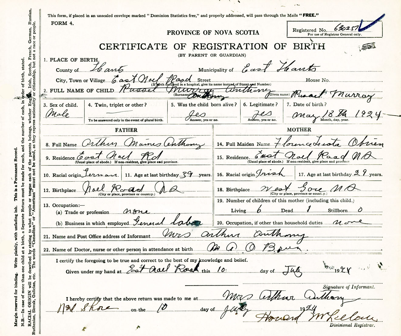 Male Birth Registration: Year: 1924 number: 63000251