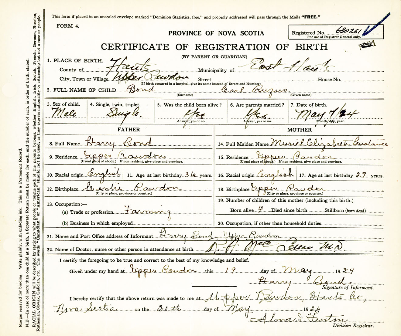 Male Birth Registration: Year: 1924 number: 63000261
