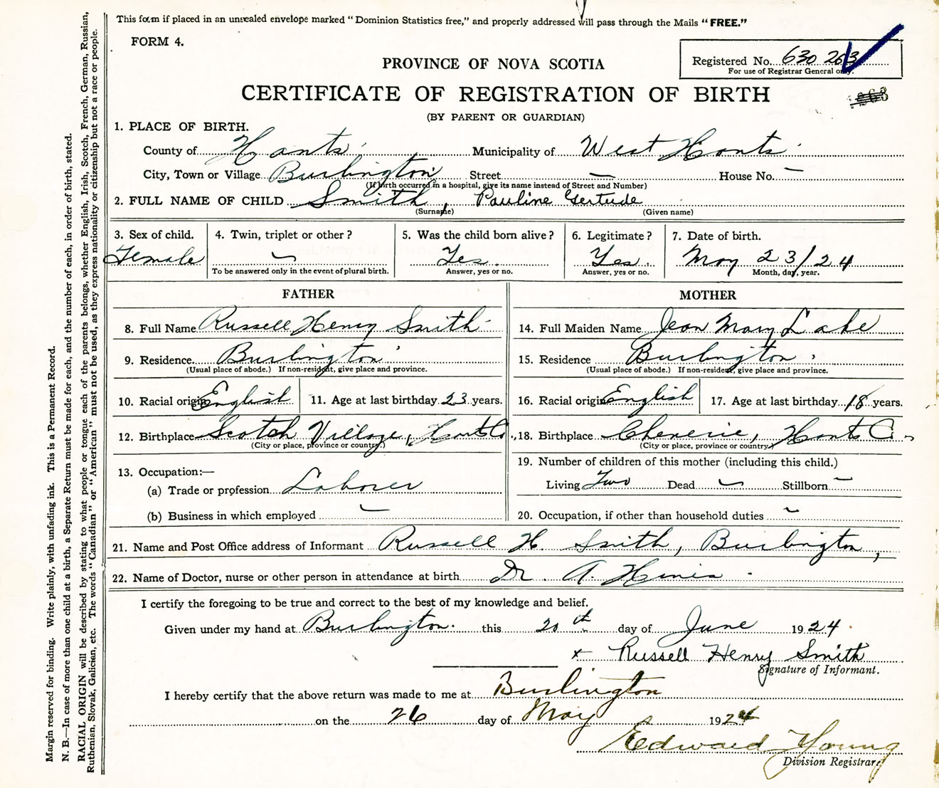 Female Birth Registration: Year: 1924 number: 63000263