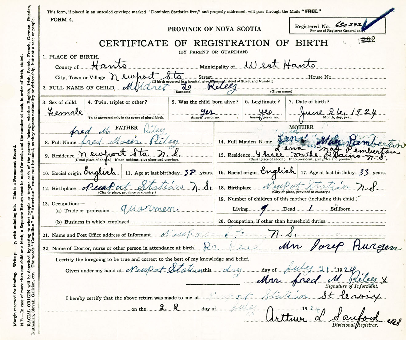 Female Birth Registration: Year: 1924 number: 63000292