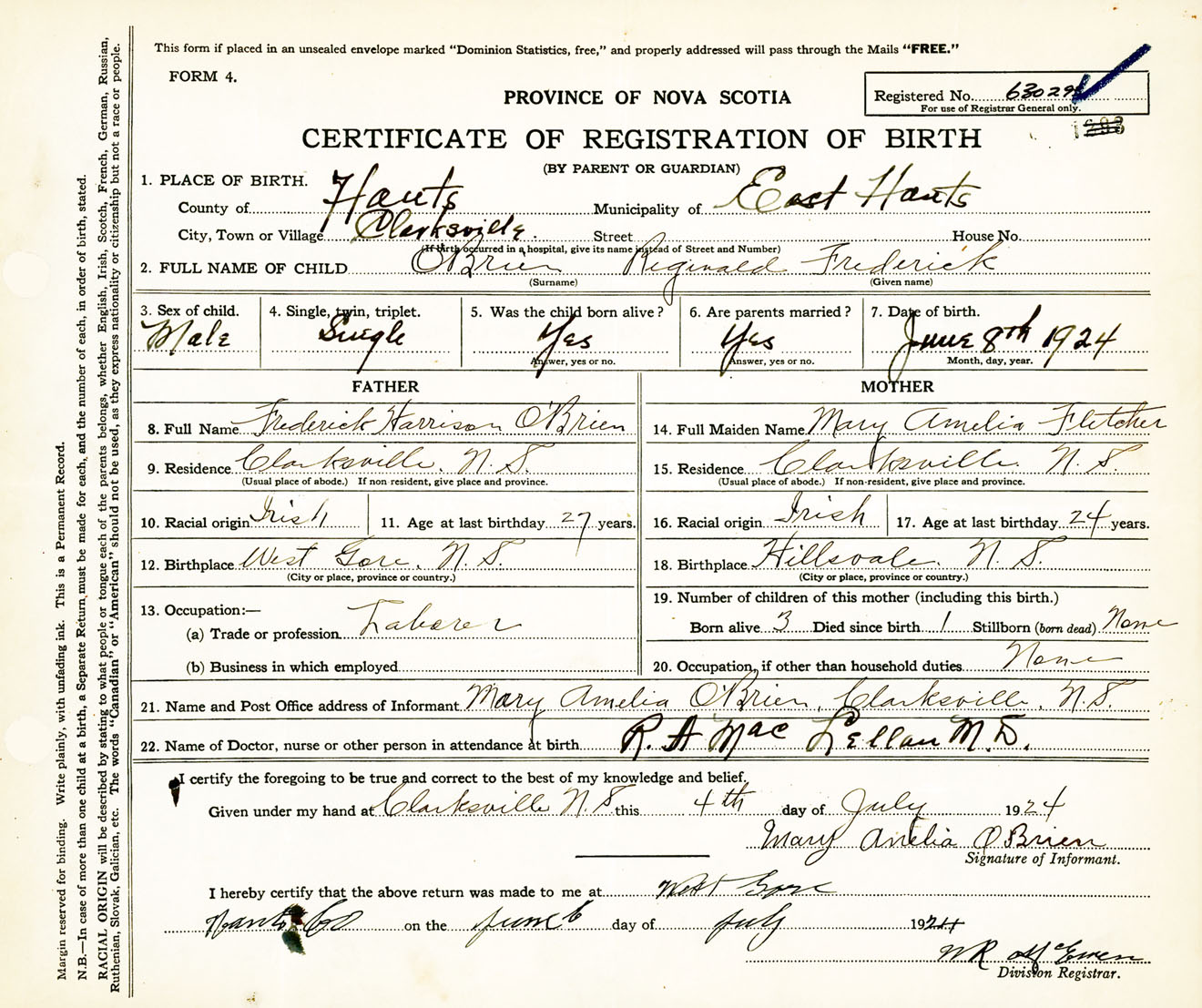 Male Birth Registration: Year: 1924 number: 63000293