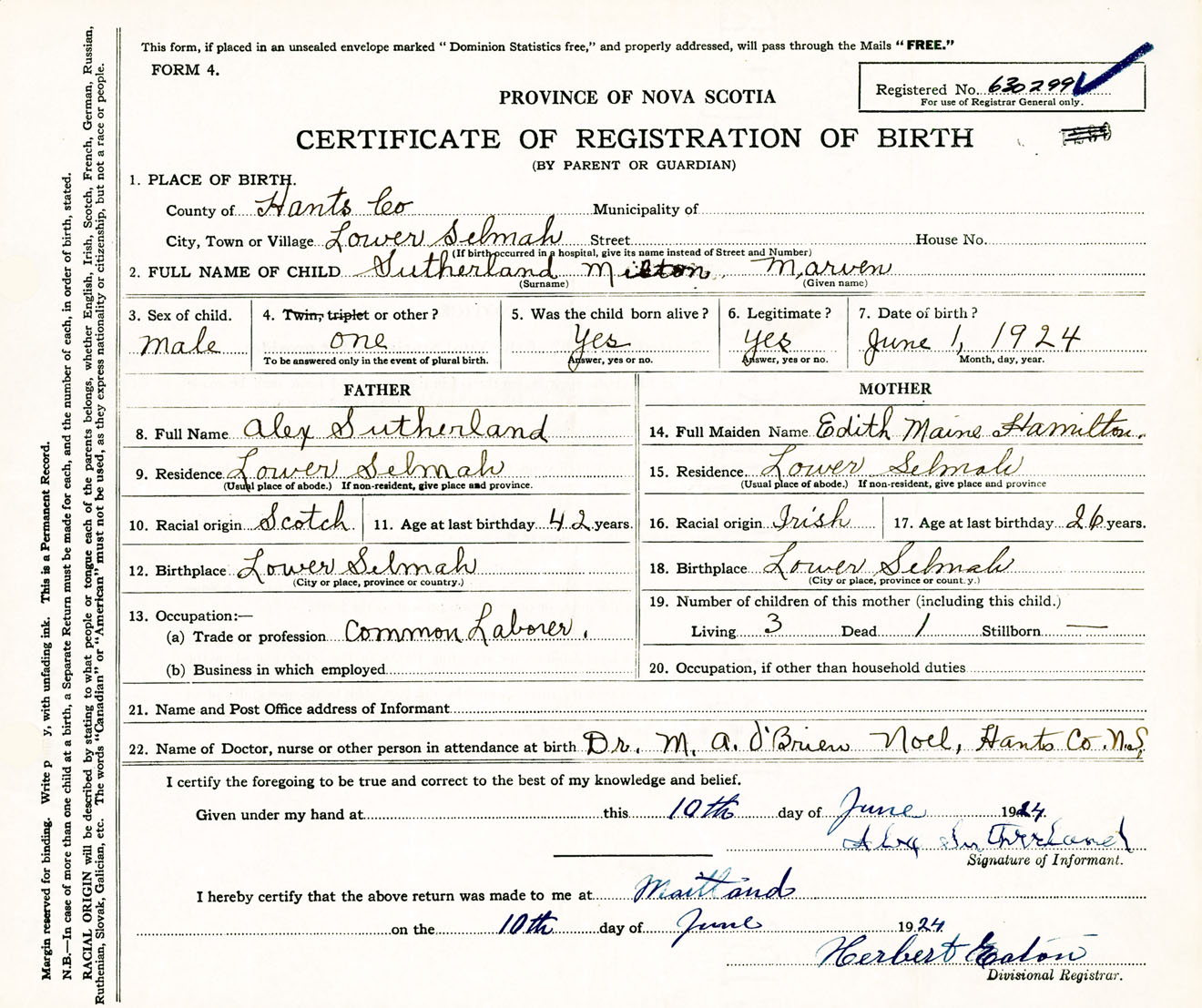 Male Birth Registration: Year: 1924 number: 63000299