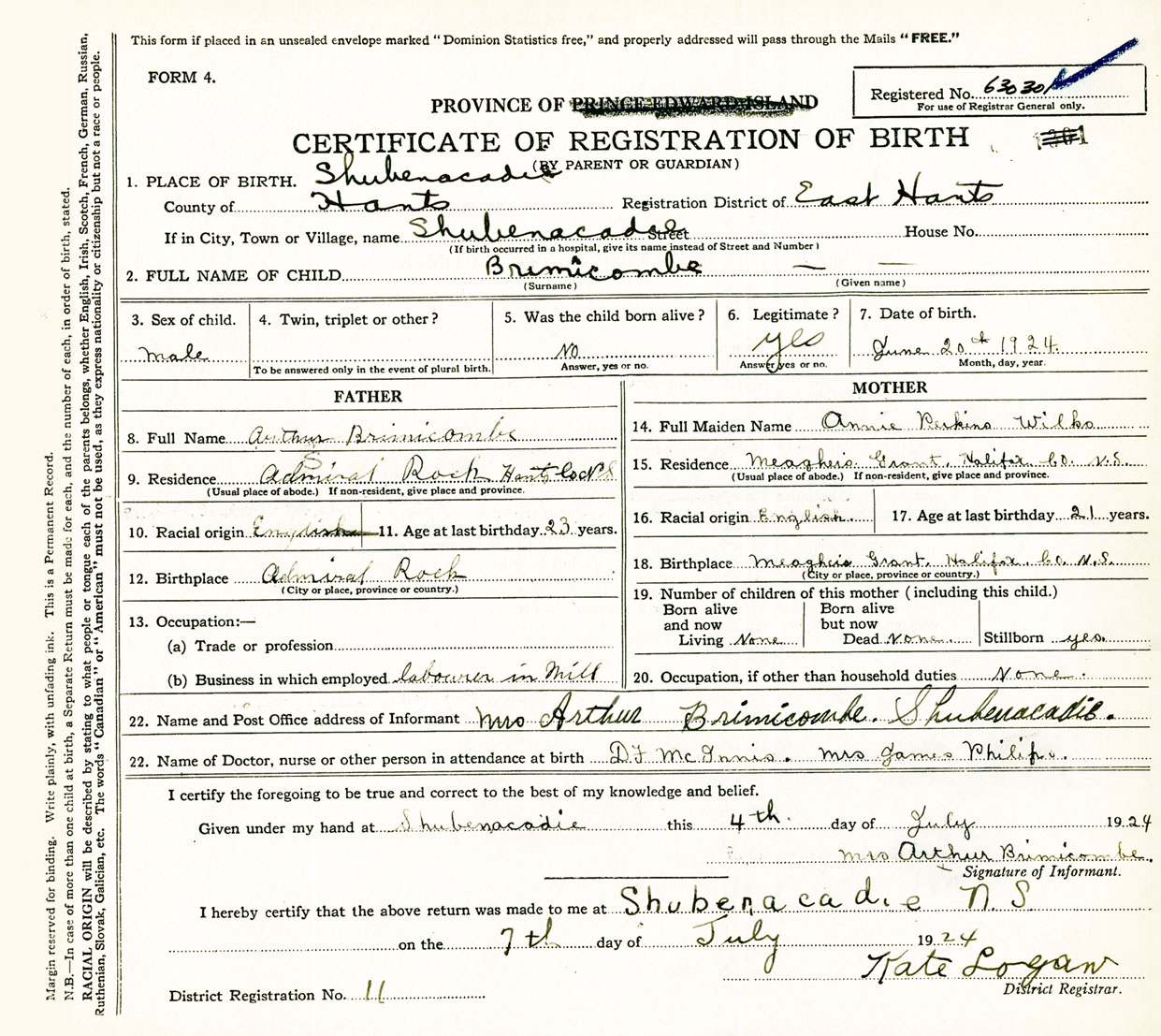 Male Birth Registration: Year: 1924 number: 63000301