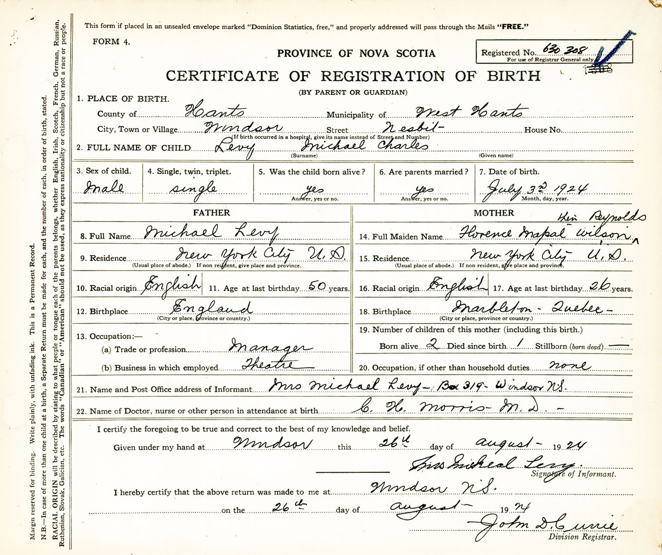 Male Birth Registration: Year: 1924 number: 63000308