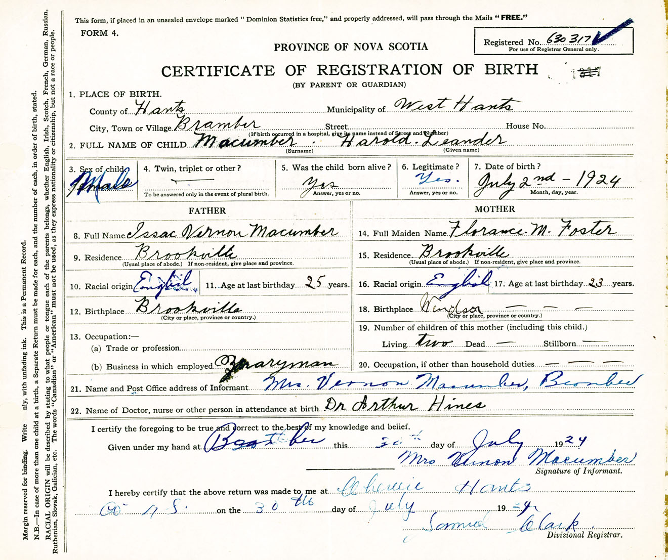 Male Birth Registration: Year: 1924 number: 63000317