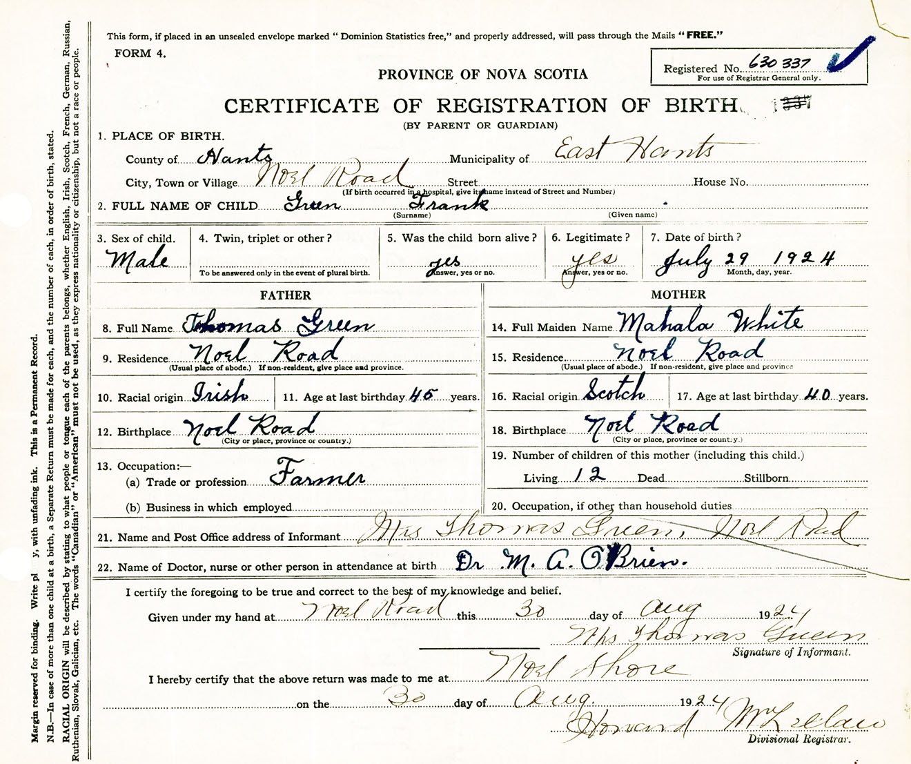 Male Birth Registration: Year: 1924 number: 63000337