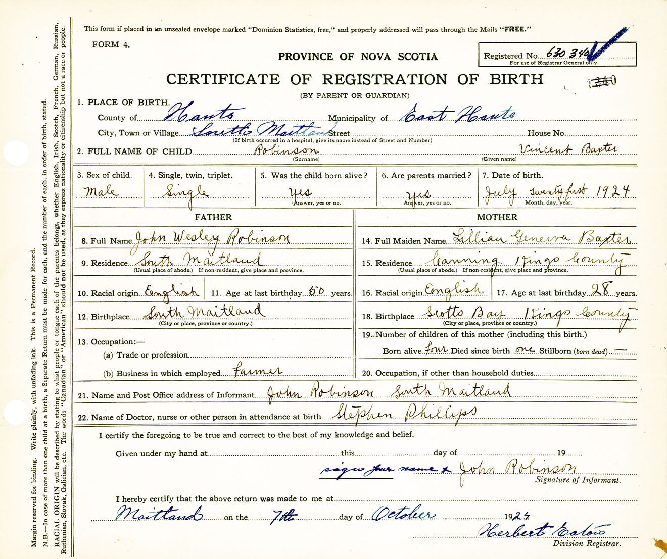 Male Birth Registration: Year: 1924 number: 63000340