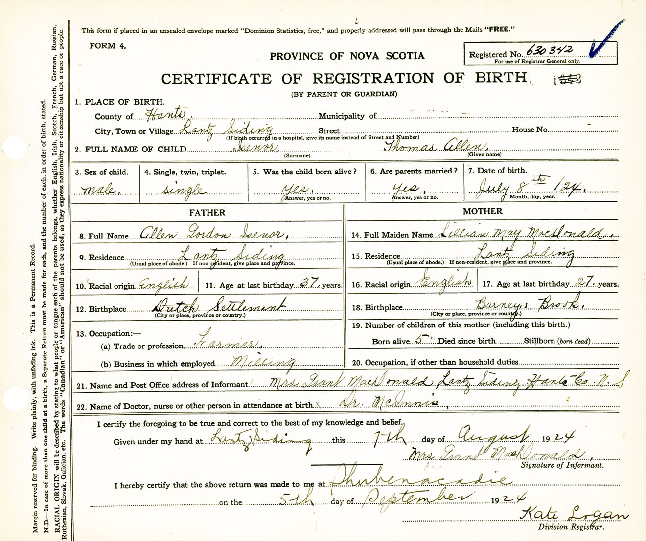 Male Birth Registration: Year: 1924 number: 63000342
