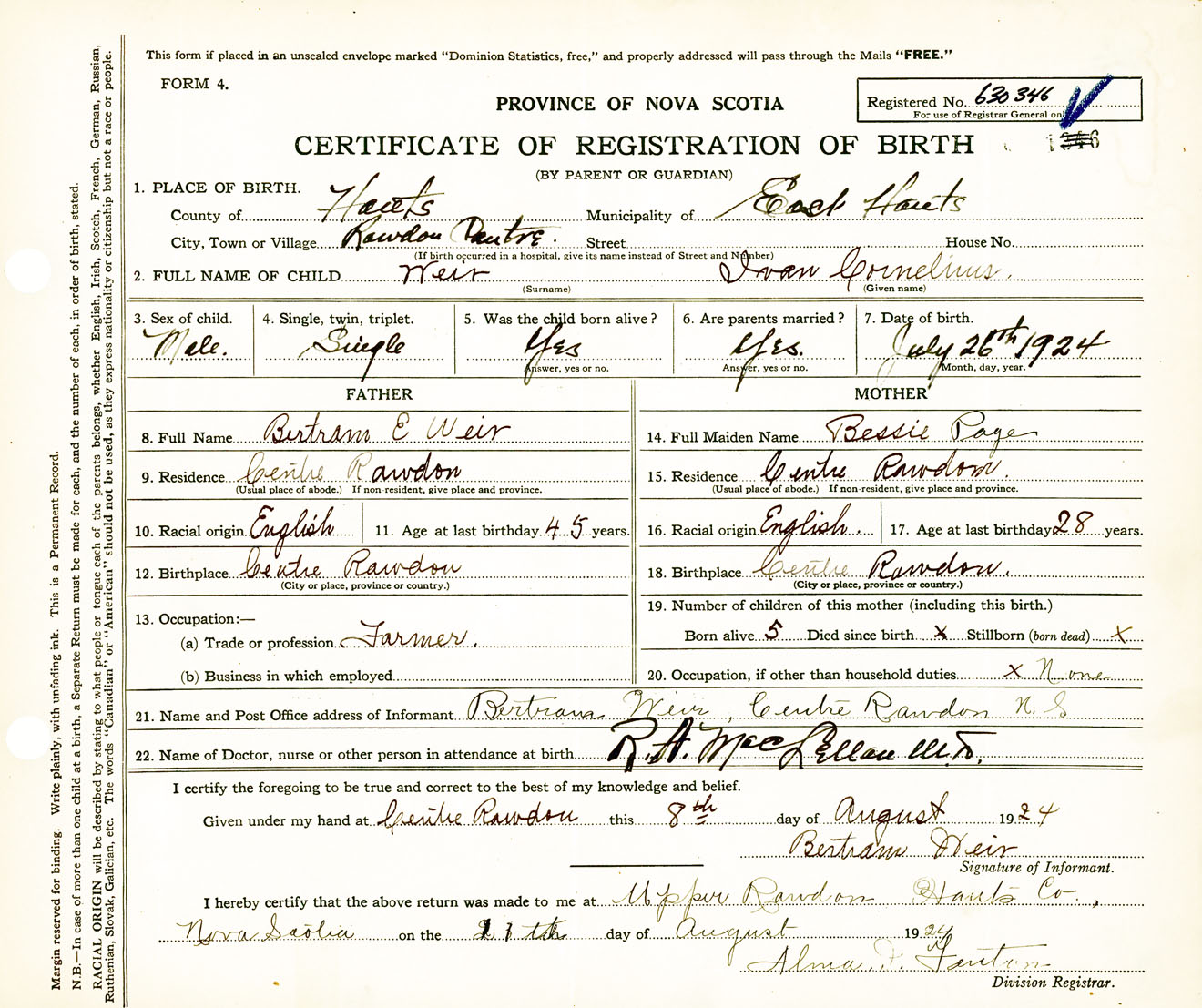 Male Birth Registration: Year: 1924 number: 63000346